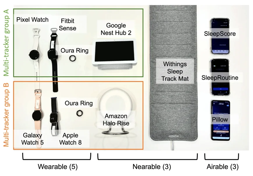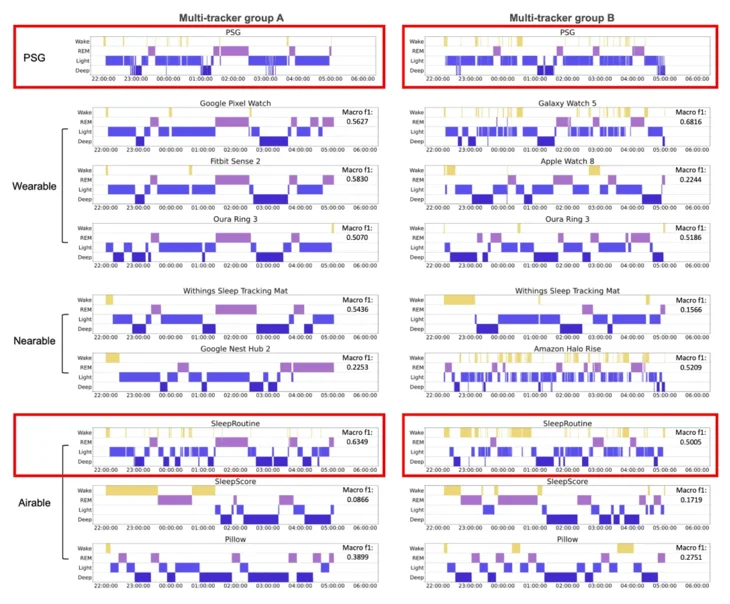 특히 웨어러블 기기들은 신체에 기기가 접촉된 상태에서 측정이 이뤄지는 만큼 측정 신호의 안정도가 높은 편인데요. 그래서 심장 박동의 변화가 크지 않은 깊은 수면 단계나 그렇지 않은 얕은 수면 단계를 상대적으로 더 잘 맞추는 편입니다. 실제 연구 결과 구글 픽셀 워치, 핏빗 센스 2, 아우라 링처럼 손목이나 손가락에 착용하는 웨어러블 기기는 깊은 수면 단계(Deep)를 상대적으로 잘 맞추는 경향을 발견할 수 있었습니다.