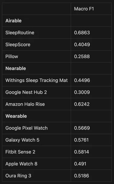이는 Macro F1 스코어를 통해 객관적인 수치로 증명됐습니다. 수면 4단계에 대한 슬립루틴의 F1 스코어가 0.6863으로 가장 높았습니다. 다음으로 아마존 헤일로 라이즈가 0.6242로 그 뒤를 이었고, 핏빗 센스 2가 0.5814로 3위를 기록했습니다.