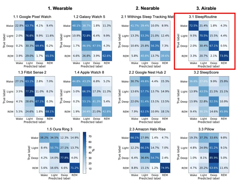 연구 결과 각 수면 단계(Wake, Light, Deep, REM) 모두를 골고루 정확하게 모니터링하는 슬립 트래커는 에어러블 기기 중 하나였던 '슬립루틴'이 유일했습니다.