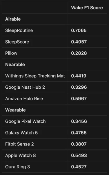 수면 4단계와 더불어 11개의 슬립 트래커 가운데 ‘수면 중 각성 혹은 깸(Wake)’ 상태를 가장 잘 맞췄던 슬립 트래커는 에어러블 기기인 슬립루틴이었습니다. 연구 결과, 수면 4단계를 감지하는 정확도(Mac F1 Score)와 함께 Wake에 대한 슬립루틴의 정확도가 가장 높게 나왔습니다.